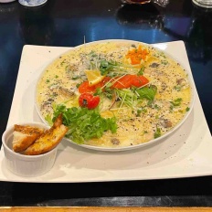 ランチ「イワサキ洋麺店 明太子クリームスープきのこアサリクラムチャウダー」in大分県大分市中央町